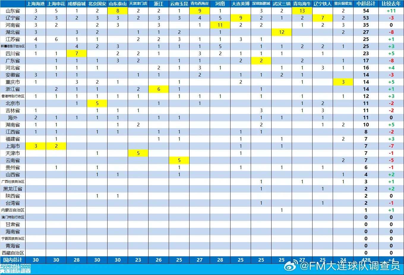 虎扑03月05日讯 从最新统计的中超各队球员来源分布来看,联赛目前共有外援80人、国内球员428人。外援方面,巴西球员仍然占据绝对主导地位,共有29人分布在各队,其次是葡萄牙、罗马尼亚等国家。国内球员来源则呈现明显的地域集中趋势,其中山东省以54人位居第一,辽宁省53人紧随其后,河南、湖北、江苏等省份也保持较高的人才输出,整体反映出中超球员培养与地域足球基础之间的紧密联系。